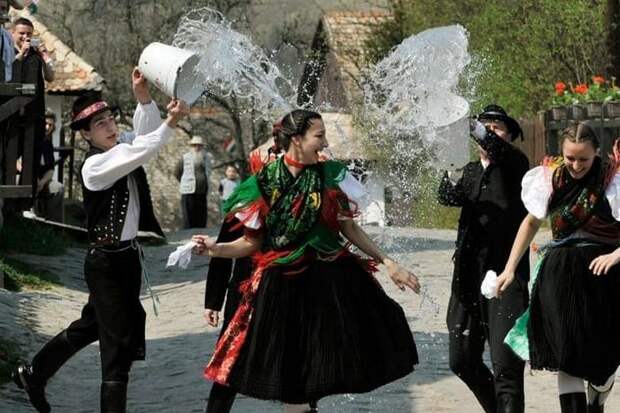 Венгерские пасхальные традиции основаны на общей теме возрождения и празднования весны. Украшенные вручную яйца уступили место коммерческим шоколадным яйцам, которые пасхальный кролик оставляет детям в пасхальное воскресенье. Однако традиционно Пасха также была временем символического очищения и, конечно же, плодородия, хотя трудно представить, как выливание ведра холодной воды на человека можно считать романтическим жестом. В пасхальный понедельник молодые люди посещали молодых девушек, чтобы прочесть им романтический стих. Затем, они обливали девушек ведром воды, чтобы они стали хорошими женами и матерями. В ответ, в качестве благодарности, женщины угощали мужчин шоколадом и стаканом венгерской палинки. Сегодня в основном не обливают водой, а опрыскивают духами.
