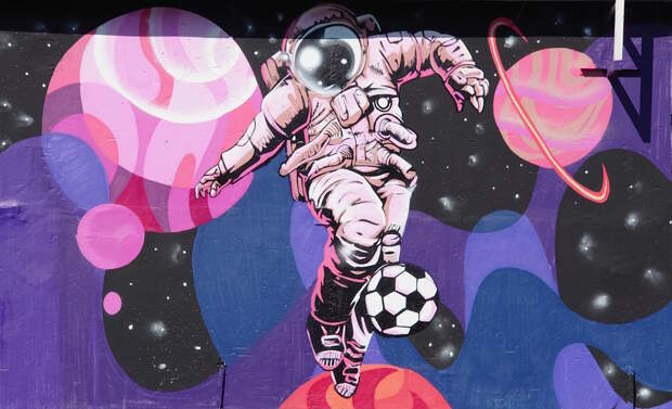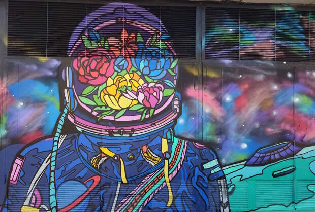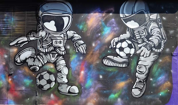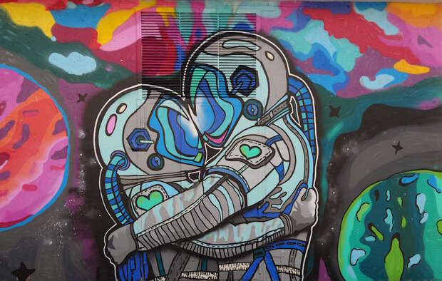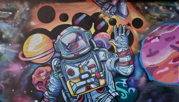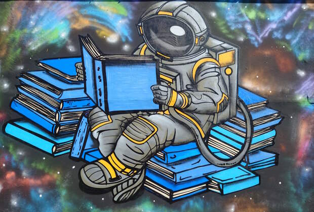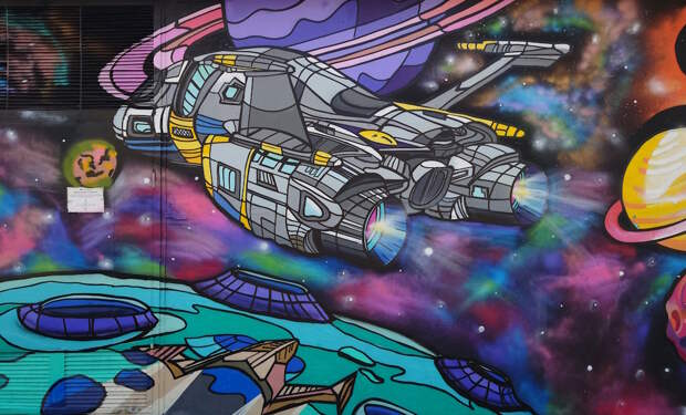 В прошлом году во время прогулок по городу наткнулся на совершено замечательно украшенную космическим стрит-артом постройку. Скучная белая распределительная подстанция стояла себе в обычном дворе, пока до нее не добрались художники. Под катом просто фотографии без комментариев.