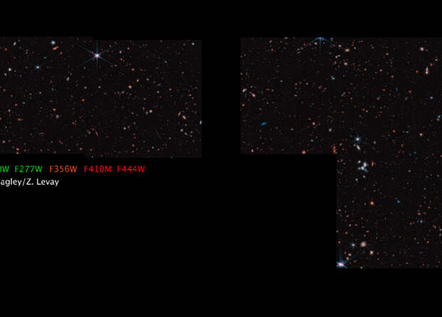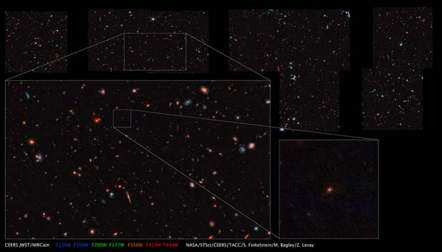 Оно содержит огромное количество галактик, существовавших в разные этапы жизни Вселенной, в том числе одного из кандидатов в рекордно далекую галактику, свет от которого шел до Земли больше 13,5 миллиардов лет, сообщается на сайте обзора, где можно скачать полномасштабные версии изображения.CEERS (Cosmic Evolution Early Release Science Survey) стал одним из первых глубоких обзоров неба, проводимых «Джеймсом Уэббом». На него отведено более 60 часов наблюдательного времени, наблюдения ведутся в ближнем и среднем инфракрасном диапазонах при помощи инструментов MIRI, NIRSpec и NIRCam и покрывают участок неба в созвездии Большой Медведицы площадью 100 квадратных минут дуги.